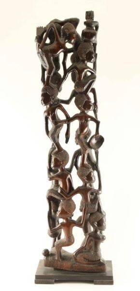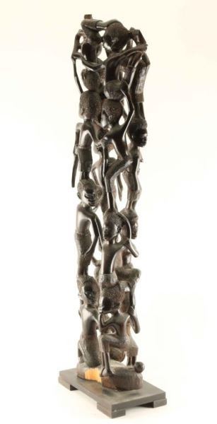 of men on top each others shoulders, measures 44"X12" carved into base P.O. BX 950 Mudyen.n, 5" chip at base and crack to one arm.