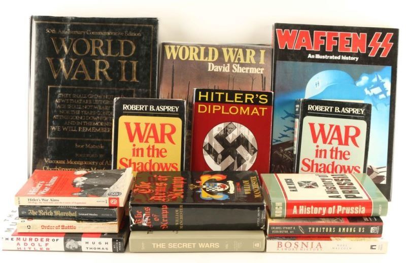 Including; World War I, World War II, Waffen SS, The Arms of Krupp, Private Breger's War, A History of Prussia, The Secret War, Bosnia, Traitors Among Us, The Murder of Adolf HItler, War in the Shadows (Vol. 1&2), Hitler's Diplomat, Soldat, Himmler, The Reich's Marshall, Order of Battle, Hitler's War Arms.