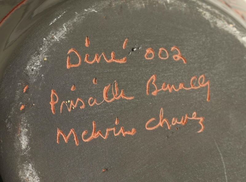 Both with fan, step and triangle designs in black. Both signed 'Priscilla Benally & Melvin Chavez' on base. Measure 7"x8 1/4" and 9 3/4"x6".