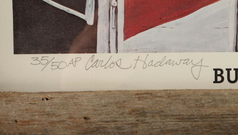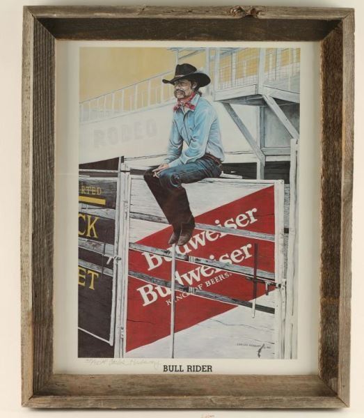 "Bull Rider" by Carlos Hadaway, signed in pencil lower left 35/50 AP. Image measures 19" x 15" in rustic barnwood frame. Carlos is perhaps most well known for his license with Anheuser-Busch, where he created a series of six western prints featuring Budweiser.