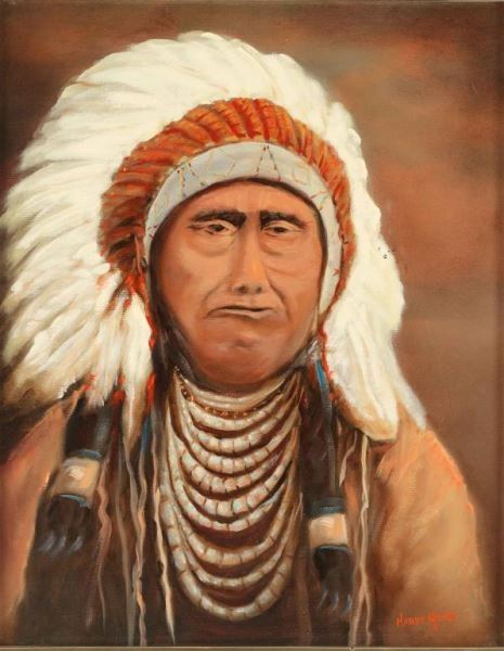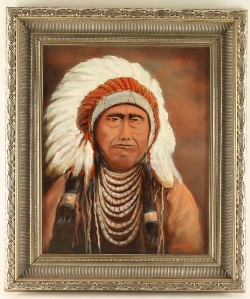 by local Arizona artist Hardy Quade. Depicting an Indian Chief, image size is 20"X16" in a pewter colored frame.