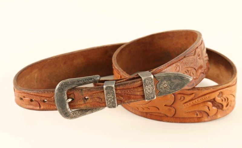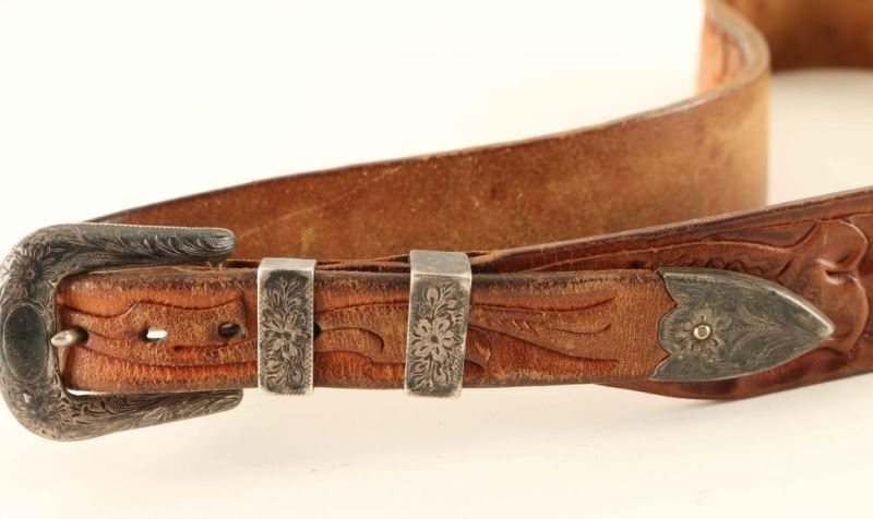 stamped MCS sterling on brown tooled belt. 29" belt probably for a child or very small person.
