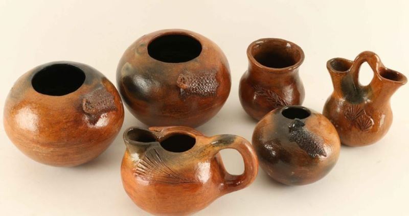 Including (3) incised carved pots, (3) pots with horny toads, (1) pot with feather, (1) small pitcher with fan design. All are signed by artist on the base. Eight pieces total, nice collection.