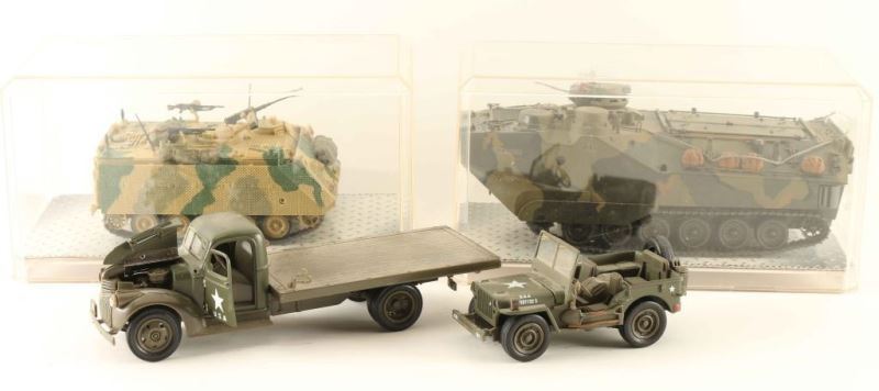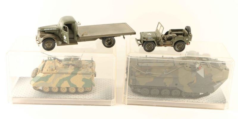 Including two tanks in plexiglass boxes, a Jeep and a 'Hickam Air Field' flatbed truck.