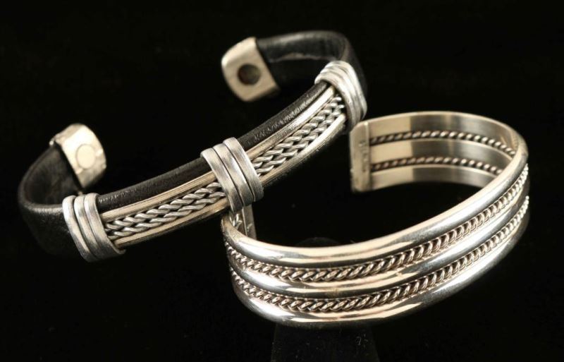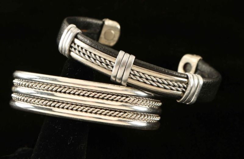 (1) Navajo made sterling silver twist wire cuff with a smooth, half round middle band flaked by hand twisted ropes. Finished with smooth borders. Measures 5/8" wide and 2 3/8" opening. Signed 'T' and 'Sterling'. (1) Silver and black leather magnetic cuff with grommet accents wrap the silver plated copper metal band with inset magnets at each end. Measures 1/2" wide. Magnet is missing on one end.