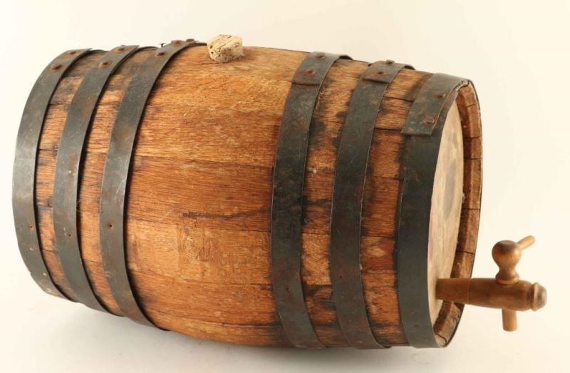 Wooden barrel with metal bands. Wooden spigot with cork on top, unmarked. Shows age and measures 13 3/4"l x 8 1/2"d.