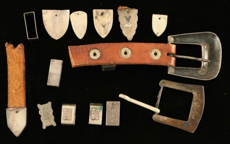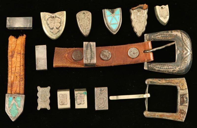 Including; sterling buckle with floral motif marked 'Sterling' and 'FM Co', buckle with geometric design and keeper, (2) sterling and turquoise belt tips, (4) floral motif belt tips, (3) floral motif keepers, and (2) smooth silver keepers.