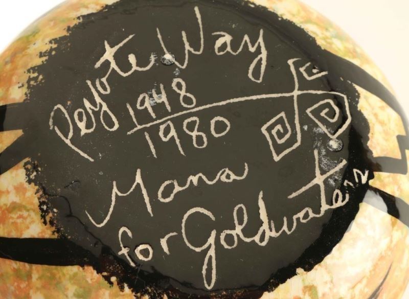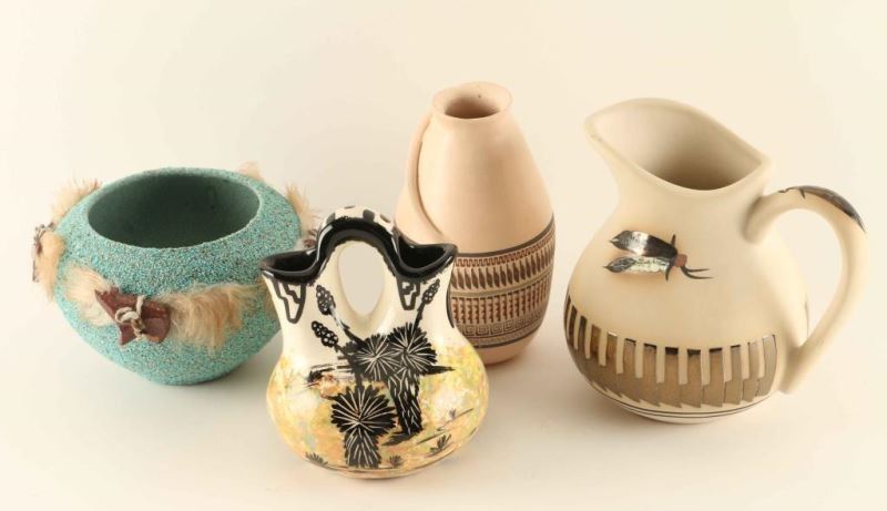 (1) Painted feather design pitcher signed 'Marilyn' measures 6 1/2"hx7"x5 1/2". (1) Turquoise color pot with textured design with stone bear and feather design. Measures 4 1/4"hx7". Unsigned (1) Glazed wedding vase with quail and cactus design measures 6 1/4"hx 4 1/2" signed Mana for Goldwaters. (1) Vase with incised carved feather design signed 'Ben Billy'. Measures 6 3/4"x 3 1/4".