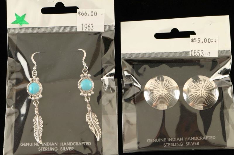 Hopi man in the maze design set on discs of sterling silver post earrings and a pair of natural 8mm Kingman turquoise with feather dangles on french hooks.