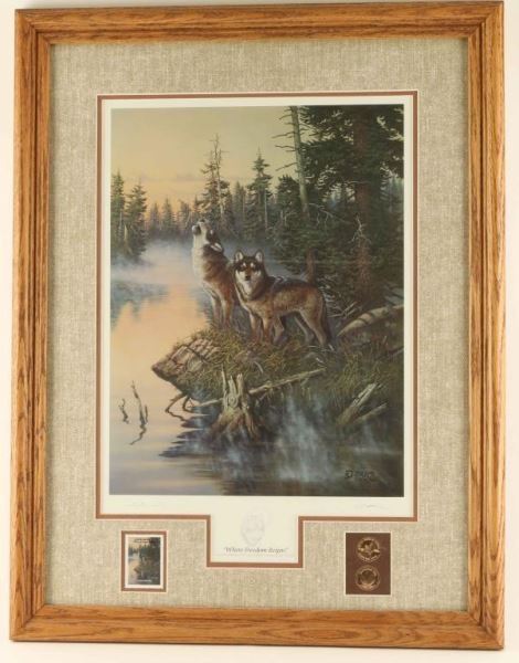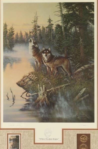 "Where Freedom Reigns" by Derk Hansen depicting wolves by a forest creek. Signed lower right. Print for the 1992 'Earth Day Series Collector's Edition' Stamp. Gold seals and stamp in cut out below print. Image measures 19"x13" in double mat with wood frame. Very nicely presented.
