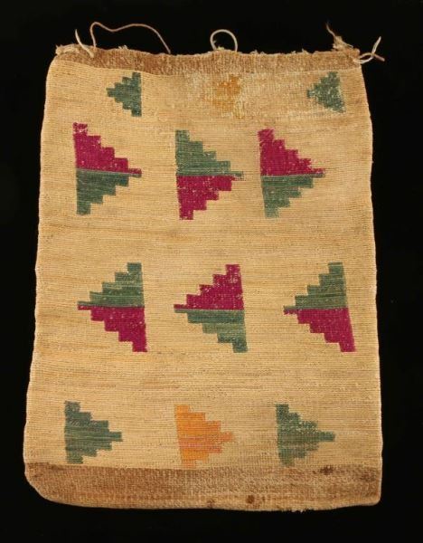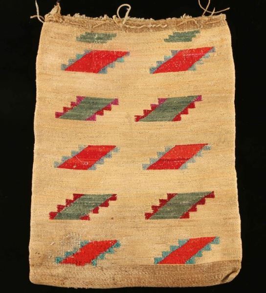 Geometric designs in red, green and blue on natural background. Measures 17 3/4" x 14".