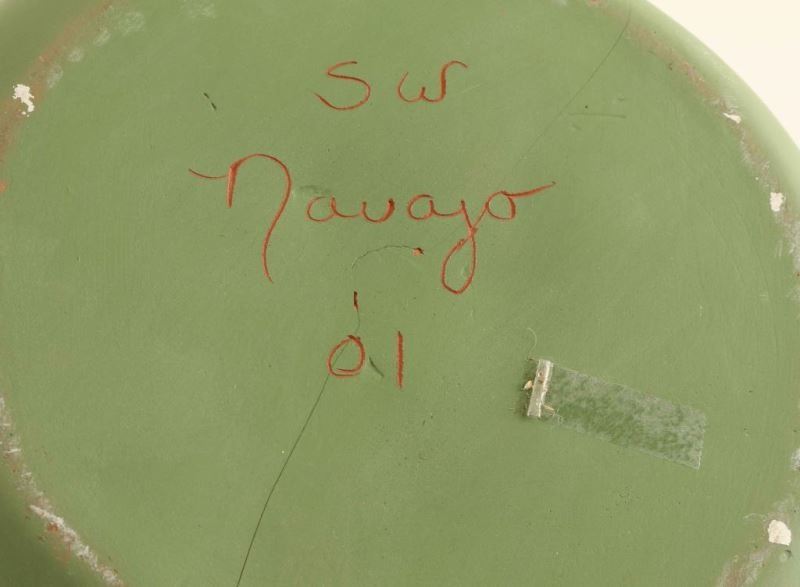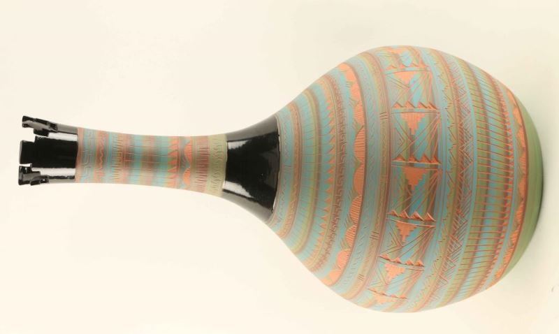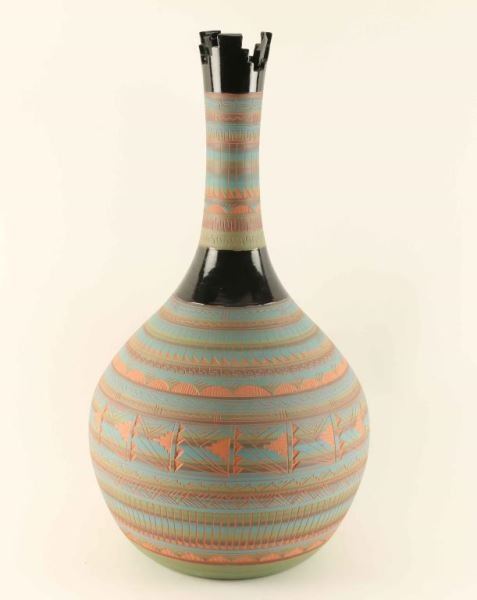 Beautiful vase with blue, green and brown with incised carved geometric design and step cutout on rim. Signed 'S.W.' Measures approx. 22"hx10"dia.