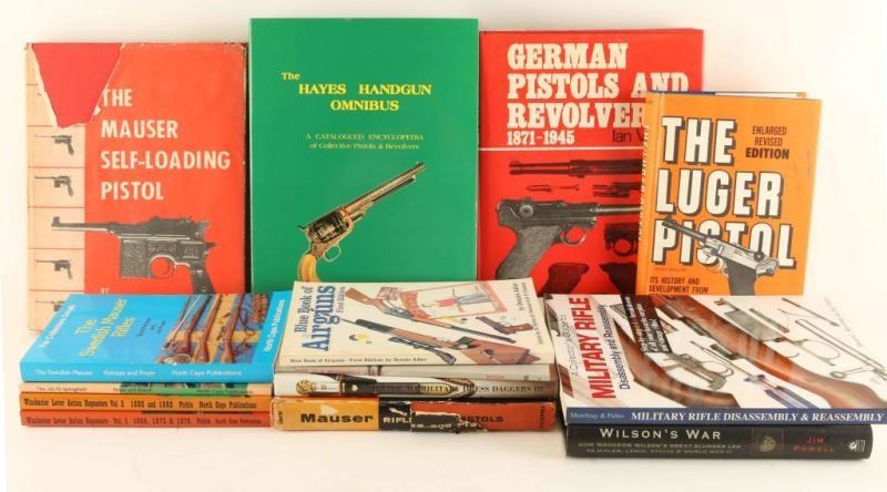 Including; Mauser Self-Loading Pistol, German Pistols & Revolvers 1871-1945, Military Rifle Assembly & Disassembly, German WWII Militaria (French), Gun Care Cleaning (2), Handgun Encyclopedia Omnibus, Luger Pistol, Mauser Rifles & Pistols, Military Dress Daggers Vol.3, Know Your Mauser Broomhandle, Blue Book of Airguns 1st Edition, Winchester Lever Actions Vol. 1 & 2, 45-70 Springfield, Swedish Mauser Rifles, Air Rifle Catalog, Original Bannerman Catalog from 1927, Abels Bowie Knife Colleciton, Wilson's War, 633 Squadron, and Planters Peanuts Our Fighting Forces (WWII Original).