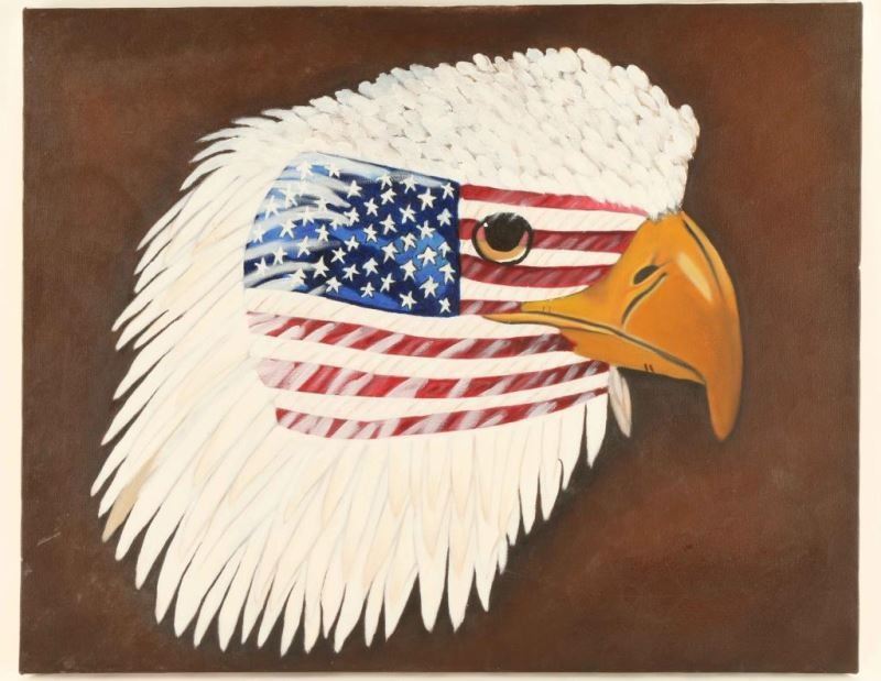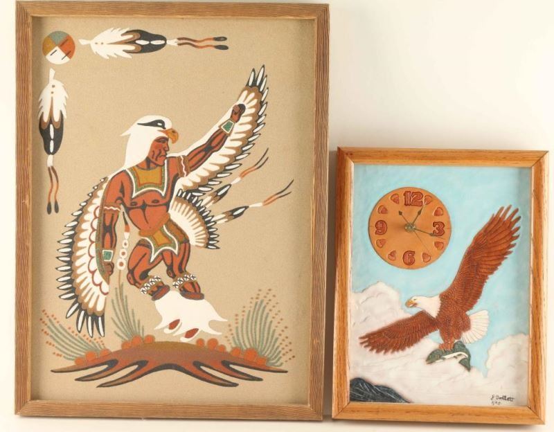 (1) Sandpainting of Eagle Dancer, image measures 13 1/4"x18 1/4" in rustic barnwood frame, signed by artist on back. (1) Eagle with American flag on canvas unsigned measures 16 "x20" unsigned. (1) Painted tooled leather of flying eagle with fish. Clock on upper left. Signed 'J.Bartlett'. Image measures 8 1/2"x11 1/2" in wood frame.