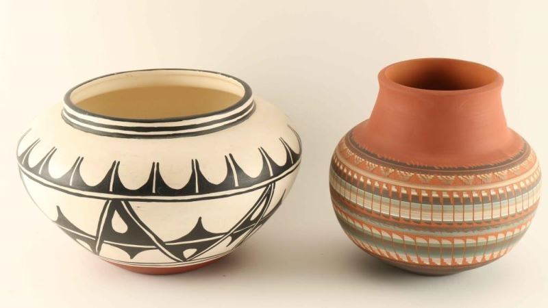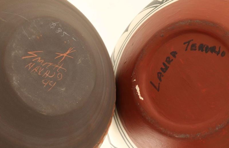 (1) Polychrome Pot with B&W Geometric pattern signed Laura Terorio measures 13"X8" (1) Incised carved Navajo Pot signed Smith measures 8"X9"