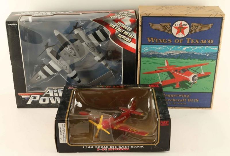 Including Air Power P38 Lightning, Racing Champions Limited Edition P-51 Mustang with Mc Donald's logo and famous red and yellow, and a Wings of Texaco 1939 Beechcraft D17S.