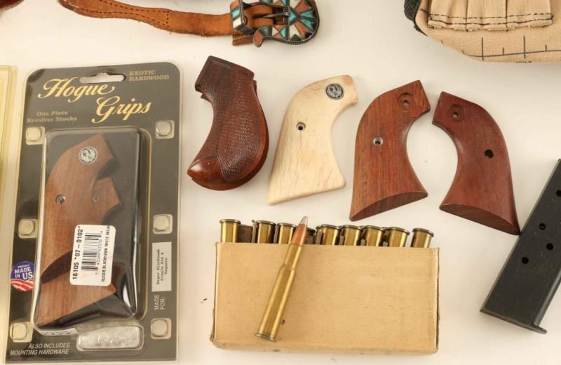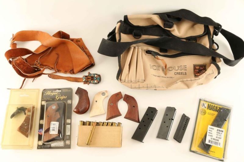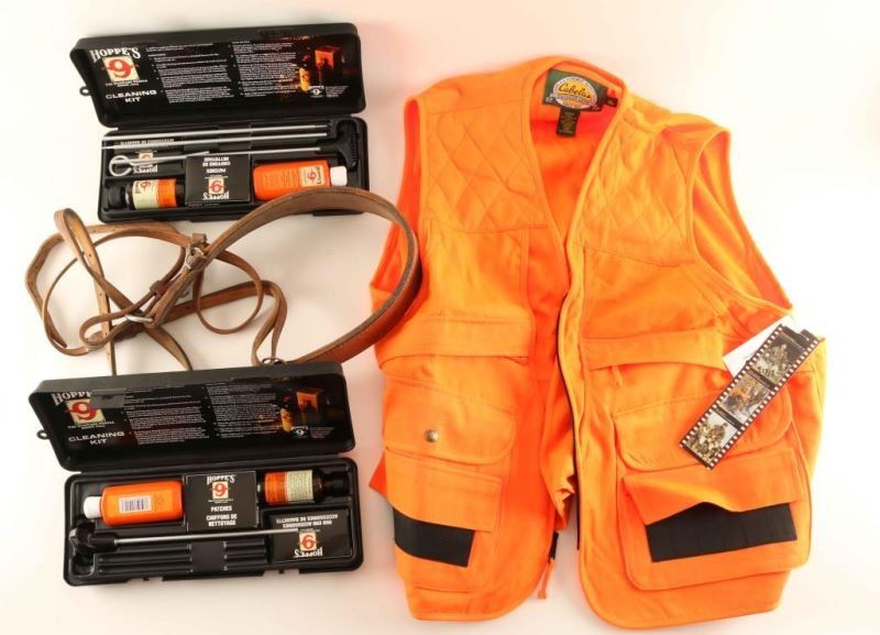 Cabela's Orange XL Vest, 2 Cleaning Kits,S&W Grips Colt 1911 after market mag, 3 other mags, 17rds of 30.40Krag, 2 sets of wooden grips, one sided ivory Ruger grip, Kreel duffle bag, and leather holster.