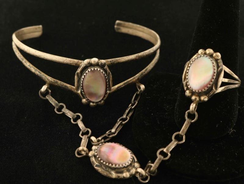 Sterling bracelet with attached ring set with 3 mother of pearl stones stamped SO sterling.