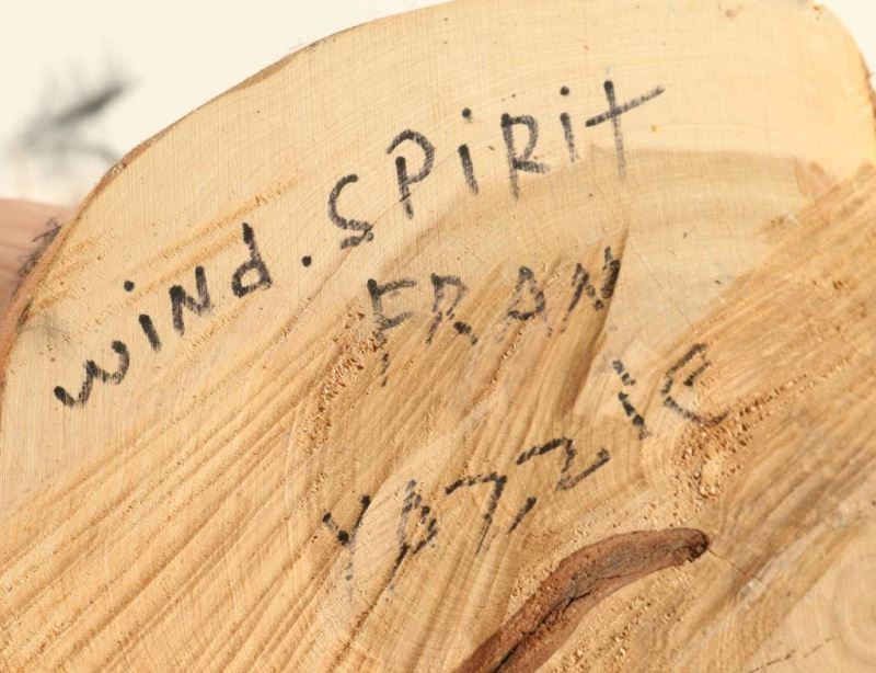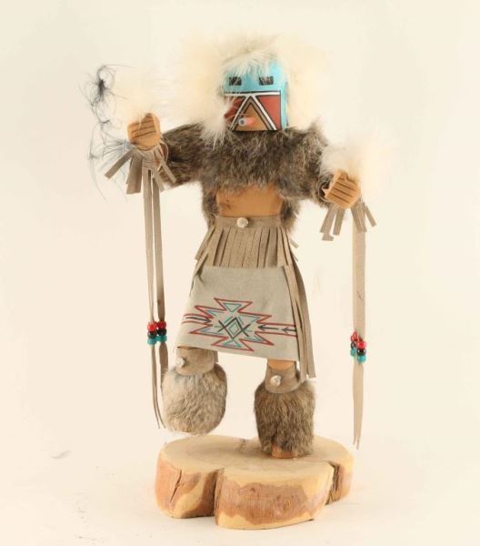 Wood construction, hand painted with fur, feather, shell and bead accents on slab base. Signed 'Fran Yazzie' on base. Measures 16 'hx8"wx7"d.