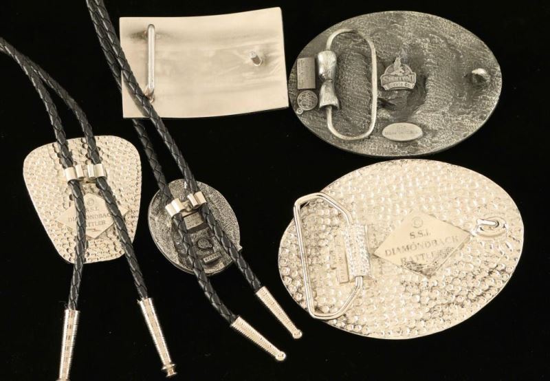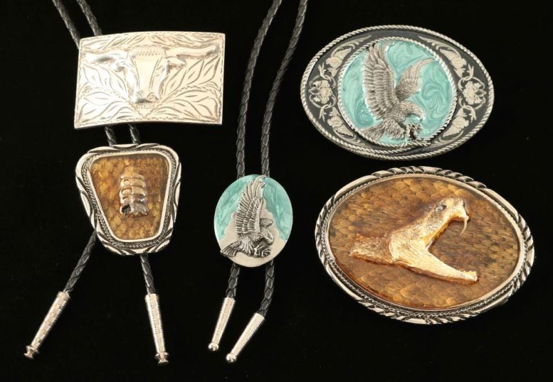 Bolo and buckle set with inlaid with diamond back rattler, Enameled bolo and Buckle with eagle, and silver overlaid buckle with long horn.