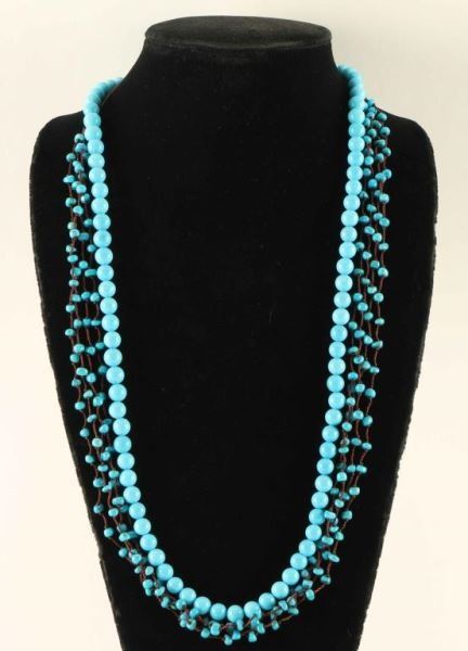 Including; four strand necklace of tiny sky blue turquoise beads hand knotted on waxed, reinforced thread approx. 31" long and a turquoise magnesite 8mm round bead necklace measures 29".
