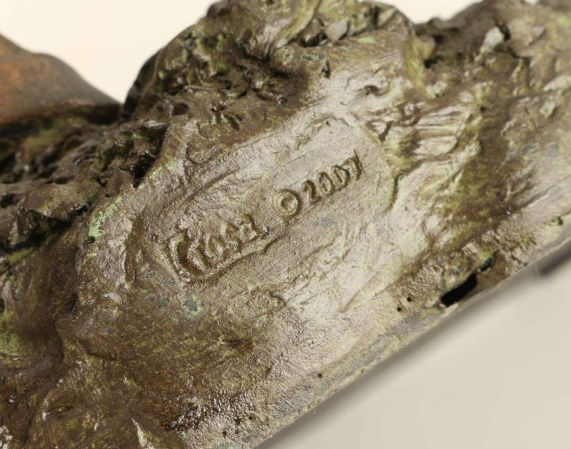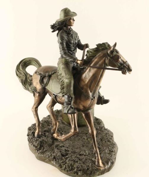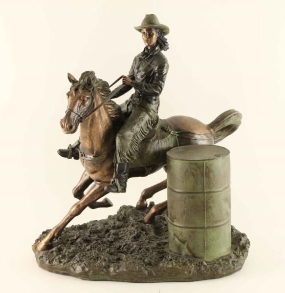 Green and bronze colored statue of cowgirl in fringed chaps rounding a barrel on her horse. Signed 'Crosa' on side of base. Measures 15 1/2"x13 1/2"x9" approx.
