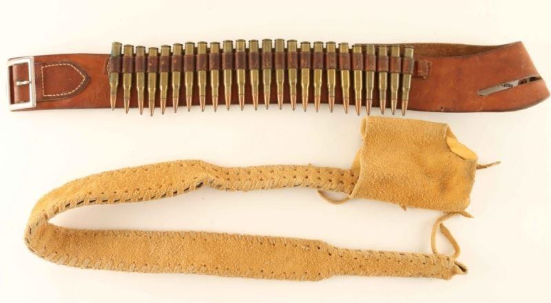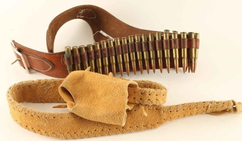 Cartridge belt with 30.06 ammo and a suede leather blackpowder bag that has been whipstitched together.