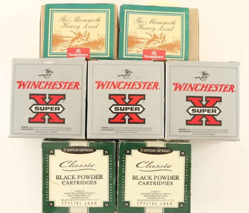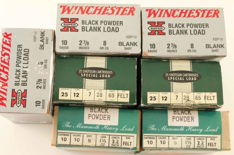 Including 3 boxes Winchester Super X Black Powder Blank Load for 10 Ga, 75 Rds, 2 boxes Classic Black Powder 12 Ca., 50 Rds and 2 boxes Gamebore The Mammoth Heavy Load 10 Ca. 20 Rds.