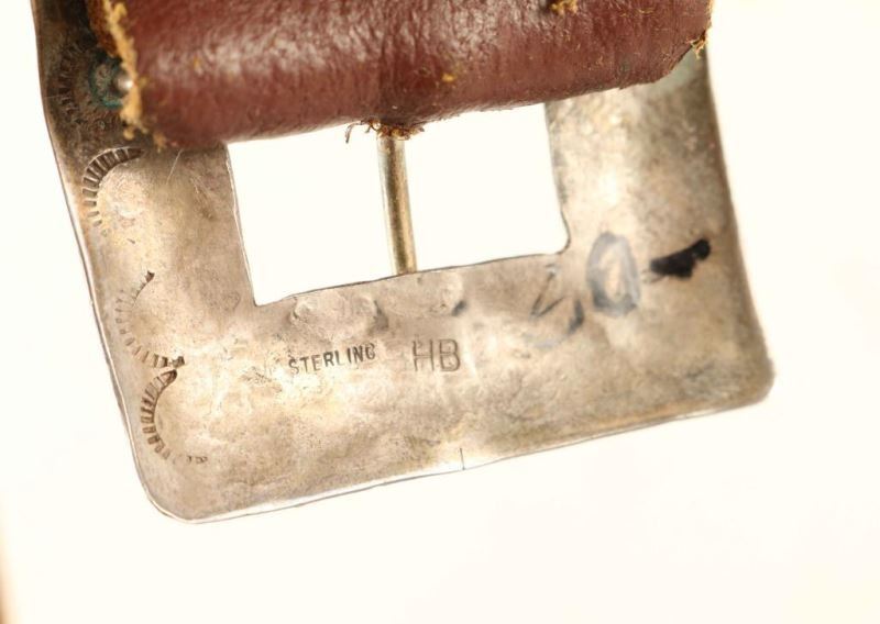 Smooth brown leather belt holds 22 Liberty Head nickels from 1901 to 1912. Buckle is a silver rectangle with an etched scallop design. Size 32