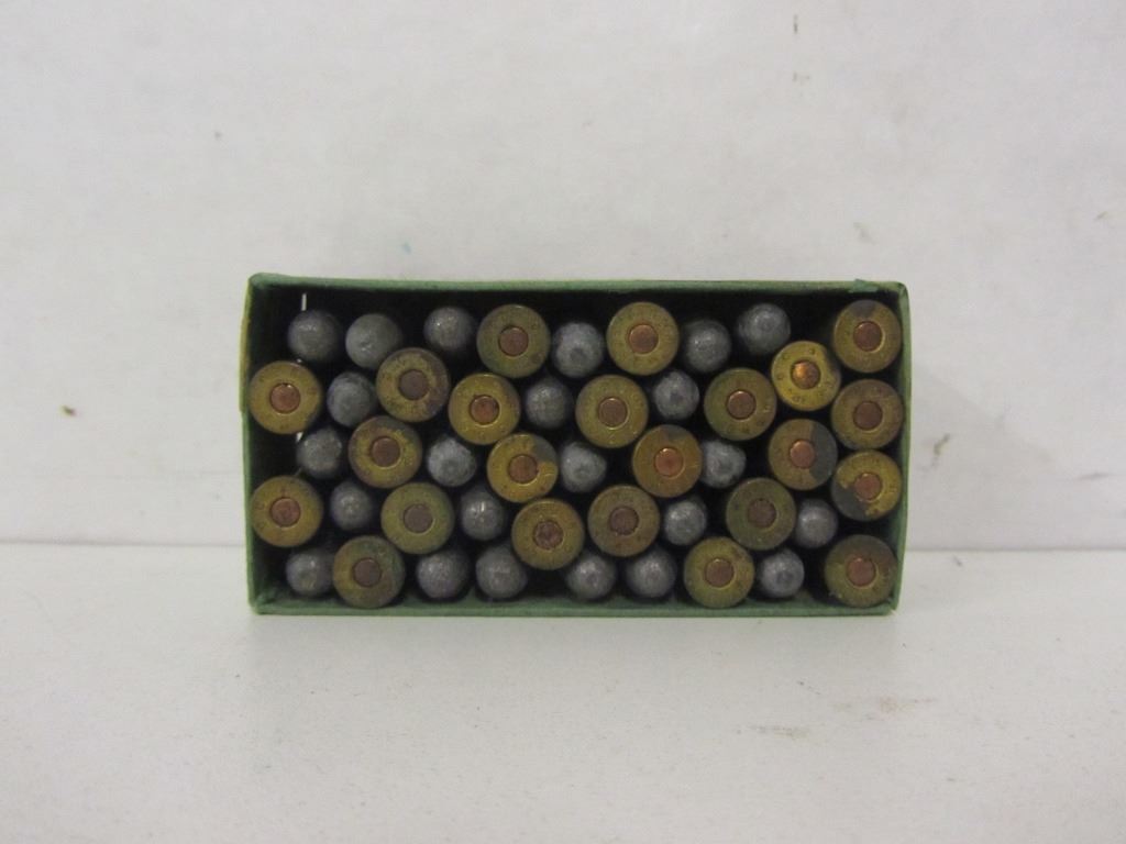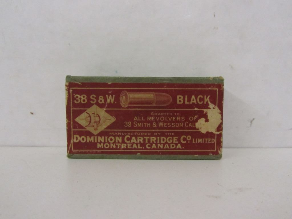 46 ROUNDS OF 38 S&W AMMO IN DOMINION CARTRIDGE CO. LTD BOX WITH ONE SPOT OF DAMAGE ON LABEL AND SOME FADED WRITING IN PEN ON THE LID.