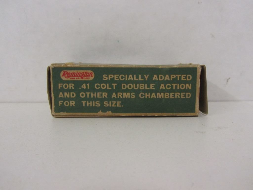 20 ROUNDS OF .41 LONG COLT AMMO IN REMINGTON KLEANBORE BOX. BOX HAS ONE TAB ATTACHED AND OTHER BROKEN OFF BUT STILL PRESENT, GOOD CONDITION OTHERWISE.