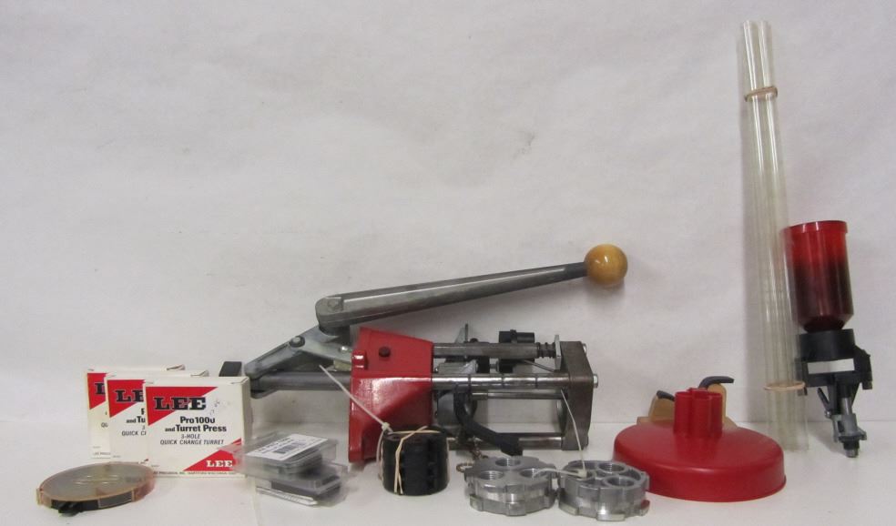 LEE 1000 RELOADING PRESS WITH ACCESORIES THREE 3 HOLE QUICK CHANGE TURRET PRESSES, #19 SHELL PLATE, MICROMETER ADJUSTABLE CHARGE BAR, PRIMER TRAY, HOPPER, TWO DIE COUPLINGS,