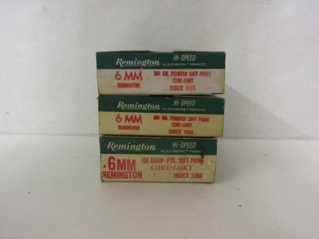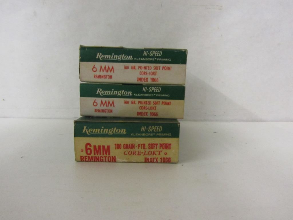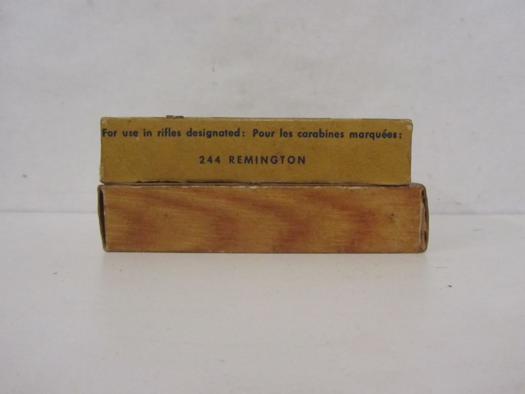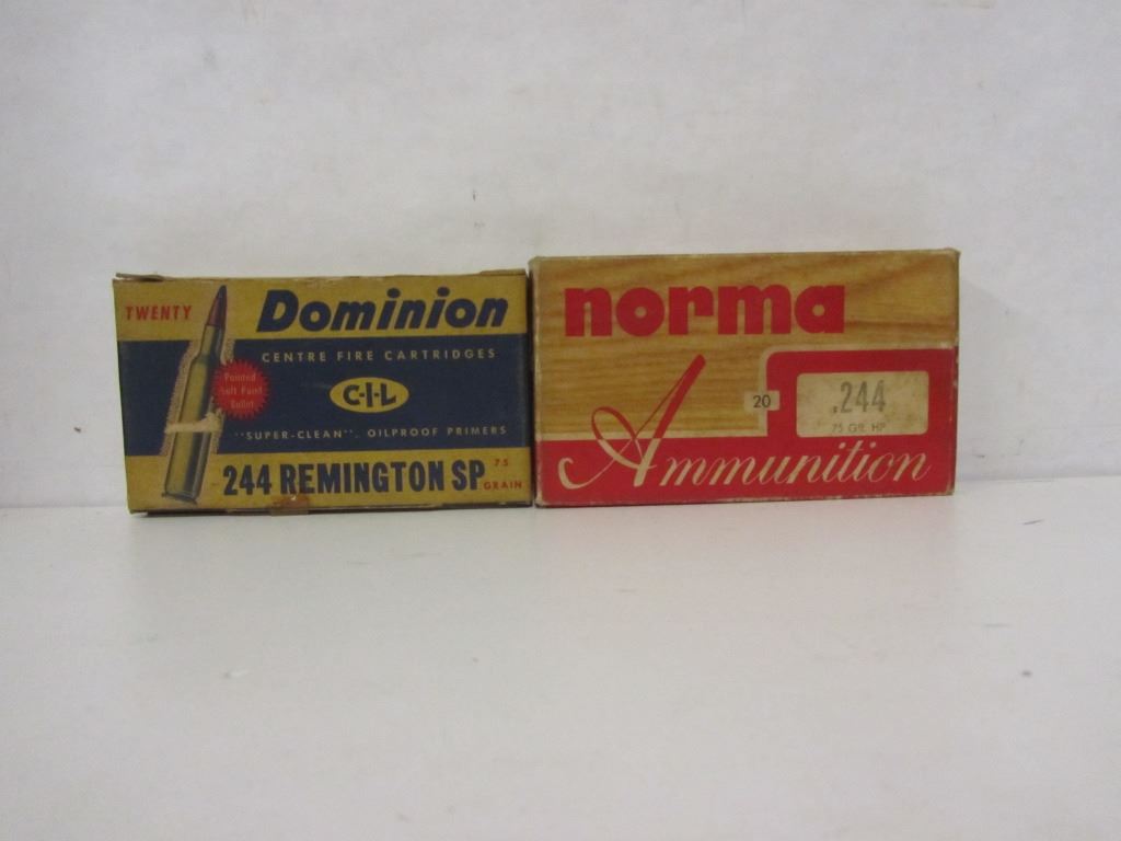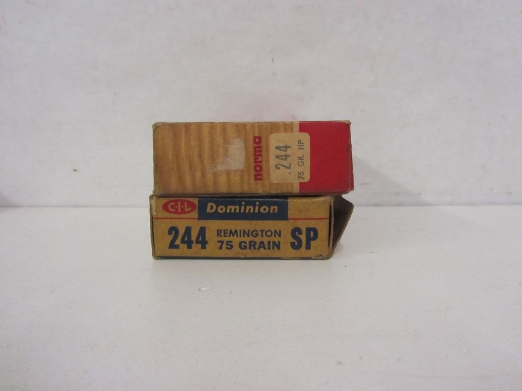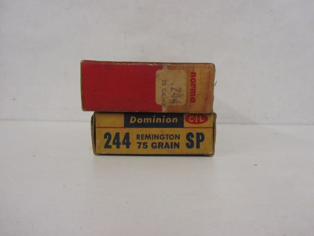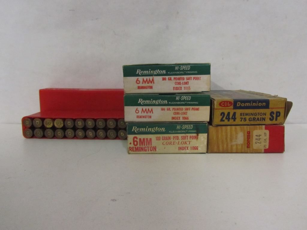 51 ROUNDS 6MM REM 9 PIECES BRASS 4 ROUNDS 244REM 56 PIECES BRASS THREE BOXES OF REMINGTON HI-SPEED 6MM REM 100GR POINTED SOFT POINT ONE BOX IS FUL ONE BOX HAS 5 EMPTIES AND ONE BOX HAS 4 EMPTIES, ONE BOX OF C-I-L DOMINION 244 REM 75GR SOFT POINT WITH 2 LIVE ROUNDS, ONE BOX OF NORMA 244 REM 75GR HOLLOW POINT WITH 2 LIVE ROUNDS, ONE MISSLABELLED PLASTIC AMMO BOX WITH 20 PIECES OF 244 REM BRASS INSIDE.