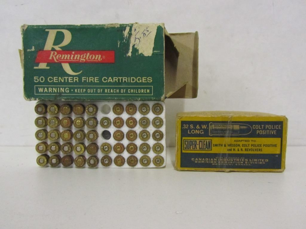 ONE BOX OF C-I-L DOMINION 32 S&W LONG 98GR WITH 46 ROUNDS INSIDE, ONE BOX OF REMINGTON 32 S&W LONG 88GR LEAD WITH 25 ROUNDS AND 23 PIECES OF BRASS AND ONE LEAD BULLET.