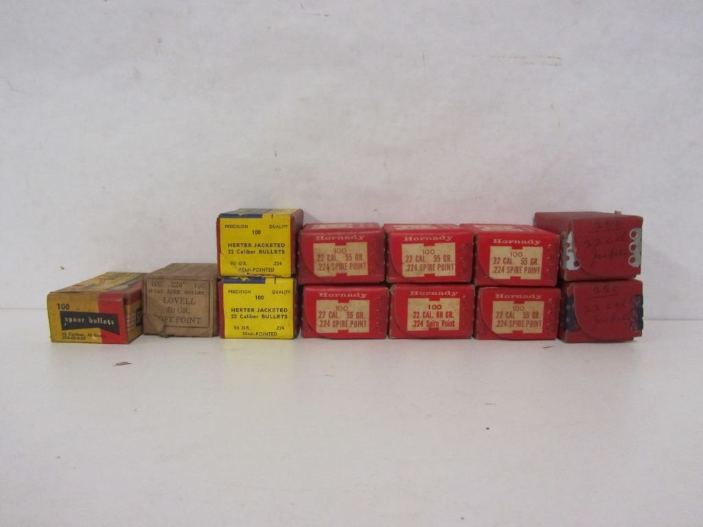 SIX BOXES OF HORNADY 22CAL 55GR .224 SPIRE POINT BULLETS LABELLED 100 PIECES EACH, TWO BOXES OF 22CAL JACKETED BULLETS LABELLED 250 PIECES EACH (BOXES LABELLED WITH PEN), TWO BOXES OF HERTER JACKETED 22CAL 50GR BULLETS LABELLED 100 PIECES PER BOX, ONE BOX LOVELL 22CAL 50GR BULLETS LABELLED 100 PIECES IN BOX, ONE BOX OF SPEER 22CAL 50GR BULLETS LABELLED 100 PIECES IN BOX.