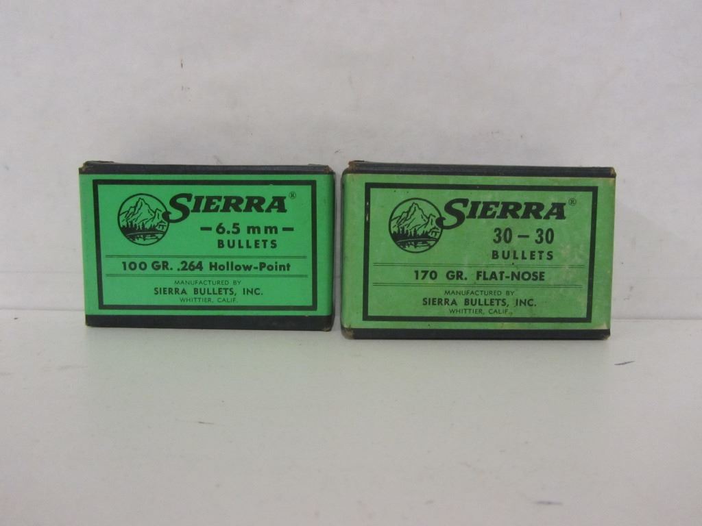 ONE BOX OF SIERRA 6.5MM 100GR HOLLOW POINT BULLETS LABELLED 100 PIECES, ONE BOX OF SIERRA 30-30CAL 170GR FLAT NOSE BULLETS WITH 5 BULLETS INSIDE.