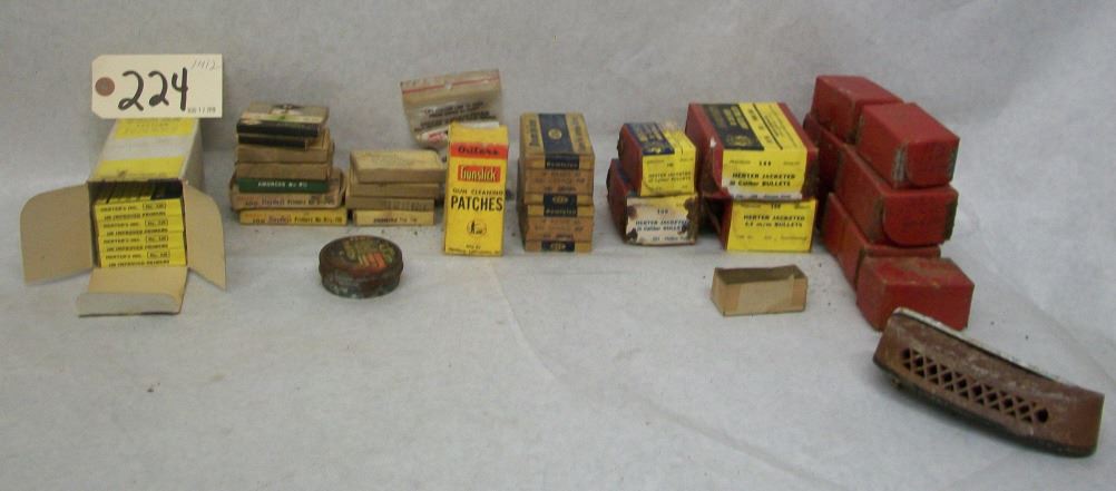 VARIOUS CALIBERS OF PROJECTILES , MOST 30 .25 AND 6.5MM. ALL HAVE SOME CORROSION. 2000 PRIMERS FOR SMALL RIFLE. 1 RECOIL PAD, 1 BUTTPLATE.