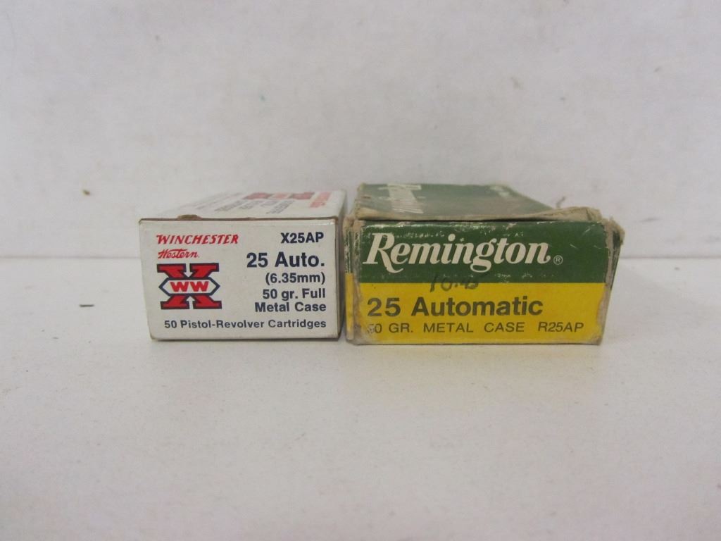ONE 50 ROUND BOX OF WINCHESTER WESTERN 25 AUTO 50GR FMJ, ONE BOX OF REMINGTON 25 AUTO 50GR FMJ WITH 60 PIECES OF BRASS