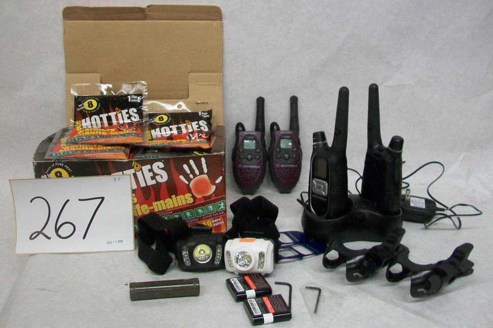 33 HANDWARMERS IN 2 PACKS, 2 MOTOROLA TALKABOUT RADIOS, 2 MOTOROLA RECHARGEBABLE 2 WAY RADIOS WITH CHARGING STAND AND HOLSTERS, 2 HEADLIGHTS AND SOME FACE CAMO.