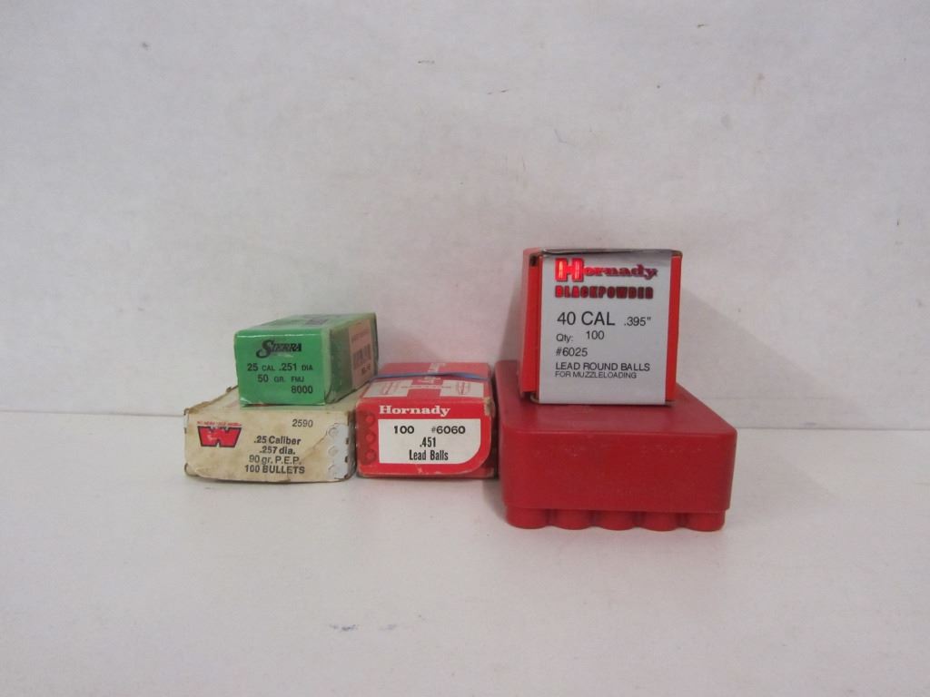 ONE BOX OF SIERRA 25CAL 50GR FMJ BULLETS, ONE PART BOX OF WINCHESTER 25CAL 90GR P.E.P. BULLETS WITH 79 PIECES, ONE BOX OF HORNADY .491 LEAD BALLS, ONE BOX OF HORNADY 40CAL LEAD ROUND BALLS, ONE PLASTIC BOX OF 45 CAL CAST 480GR BULLETS WITH 43 BULLETS INSIDE.