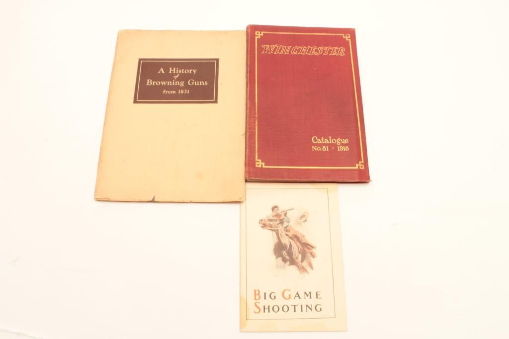 “History of Browning Guns” dated 1942 and published by Browning. Very good. Original big game shooting Standard Rifles by Standard Arms 1910 manual and Winchester catalogue No. 01 dated 1918 in very good condition.Est.: $175-$350