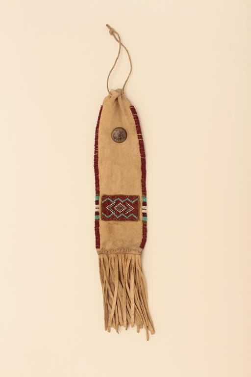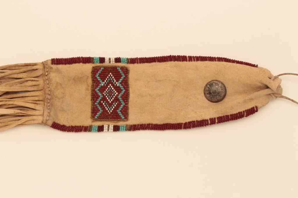 American Native Indian beaded and fringed awl case. Silvered concho. Measures 12” from tip to end by nearly 3”. 1950’s-60s. Est.: $75-$150
