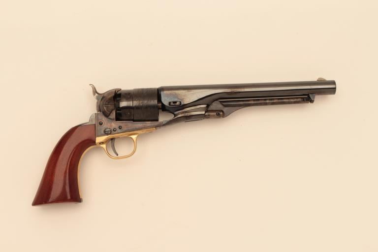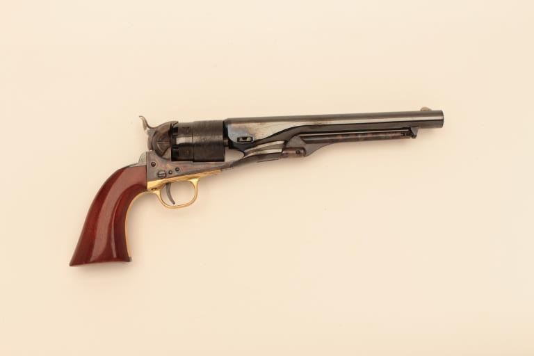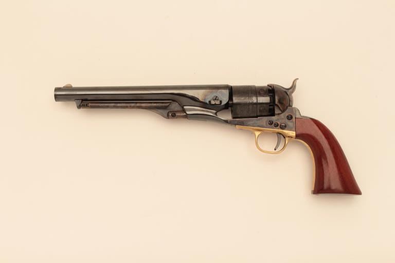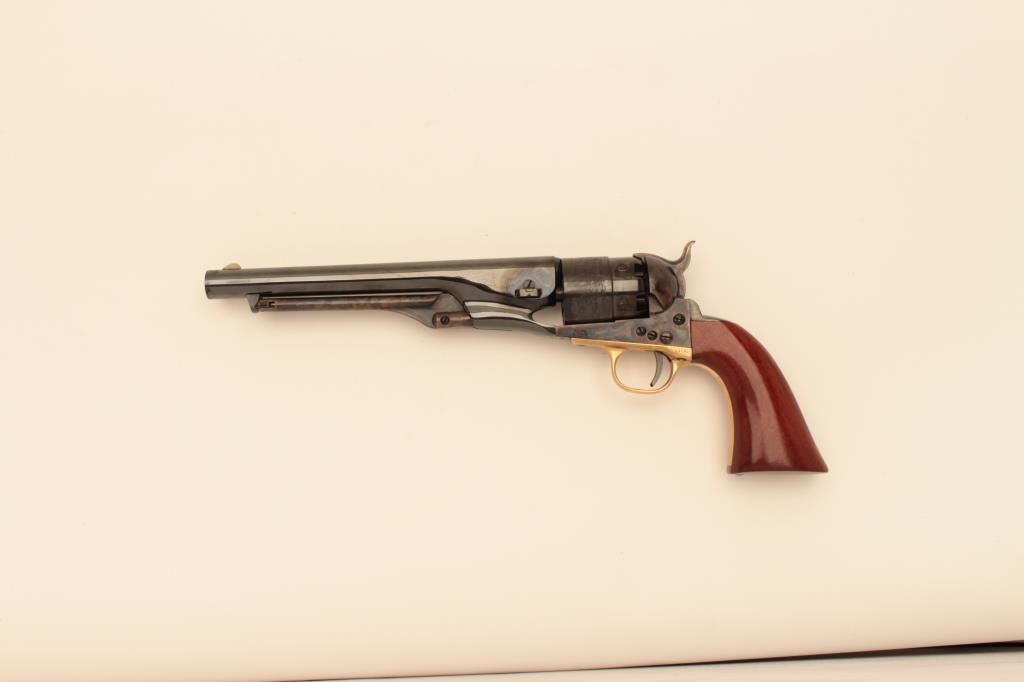 Colt 1860 Army New Black Powder Series “Signature” revolver, S/N 223696 with Sam’L signature on the back strap and 4 screw cut for stock frame. Exceptionally high polish blue and case colors. Fine to excellentcondition. Slight index line on the cylinder. 97%-99% overall. (Percussion) Est.: $300-$600