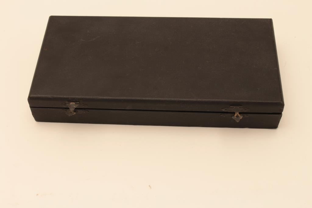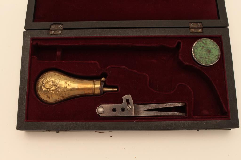 Colt 1849 London Pocket Model in .31 caliber percussion with a 6” barrel, S/N 9283. Fair to good overall with matching numbers and British proofs. Good grips. Minor restoration to cylinder and coloring to the metal. Cased with correct flask, mold and Eley cap tin with good label. The case is 1980’s Pelson finely made in French style. (Antique) Est.: $750-$1500