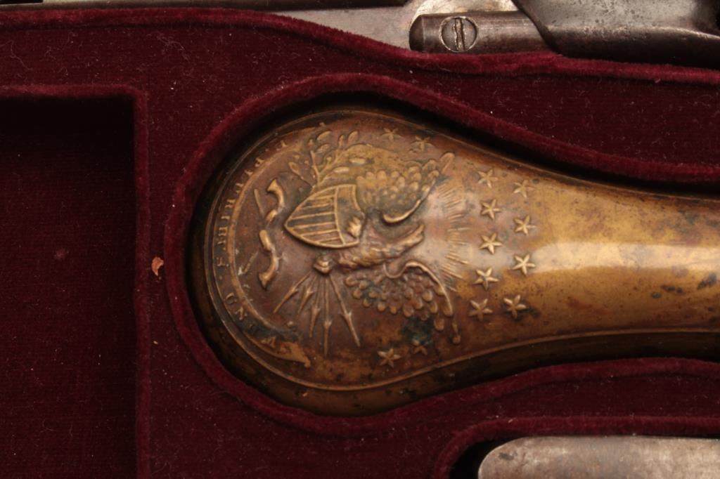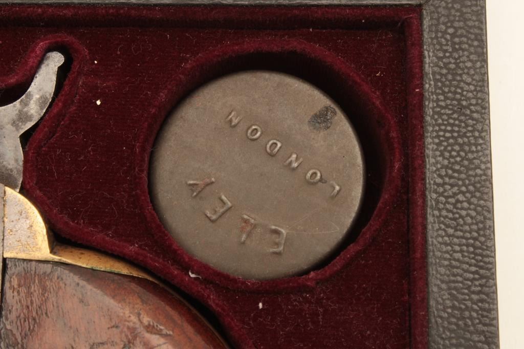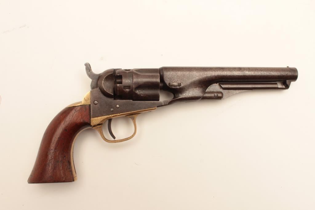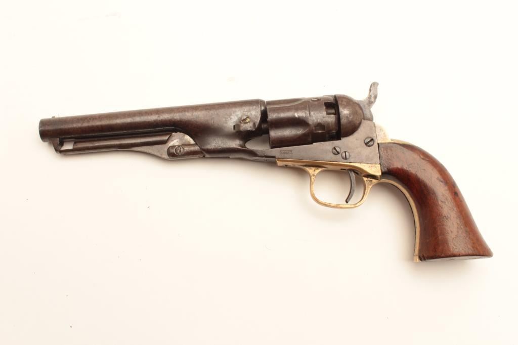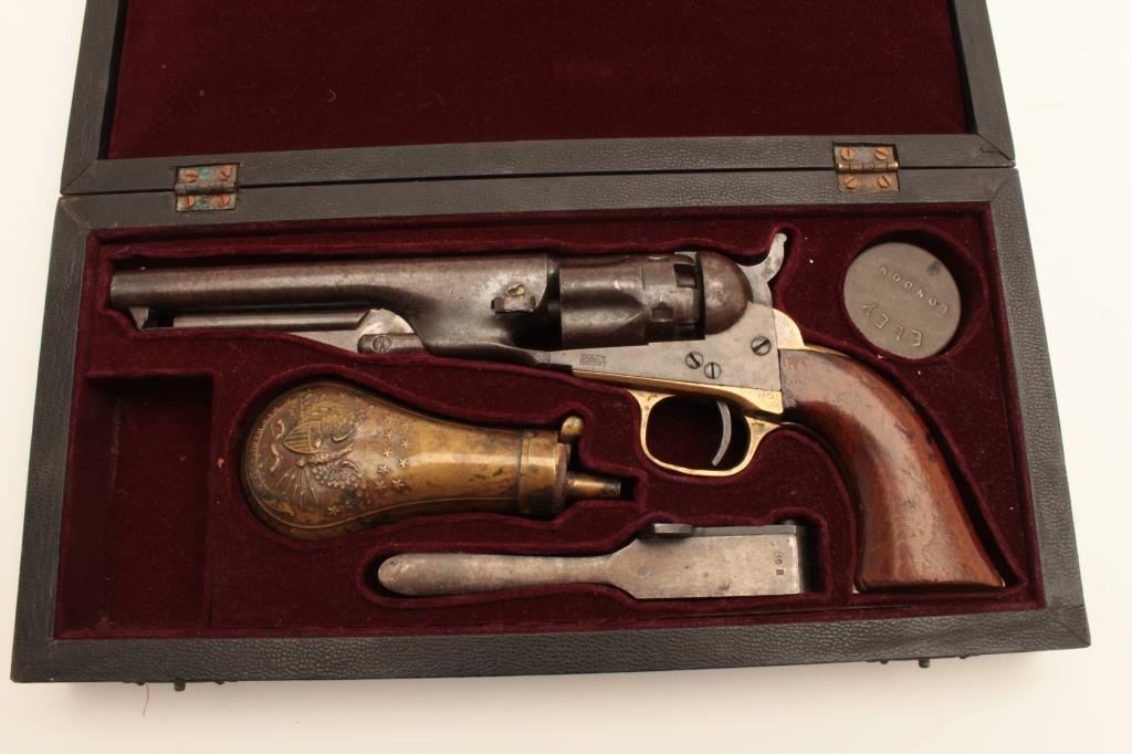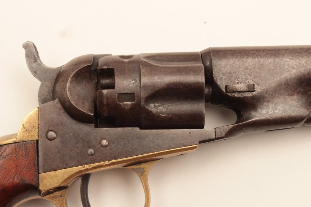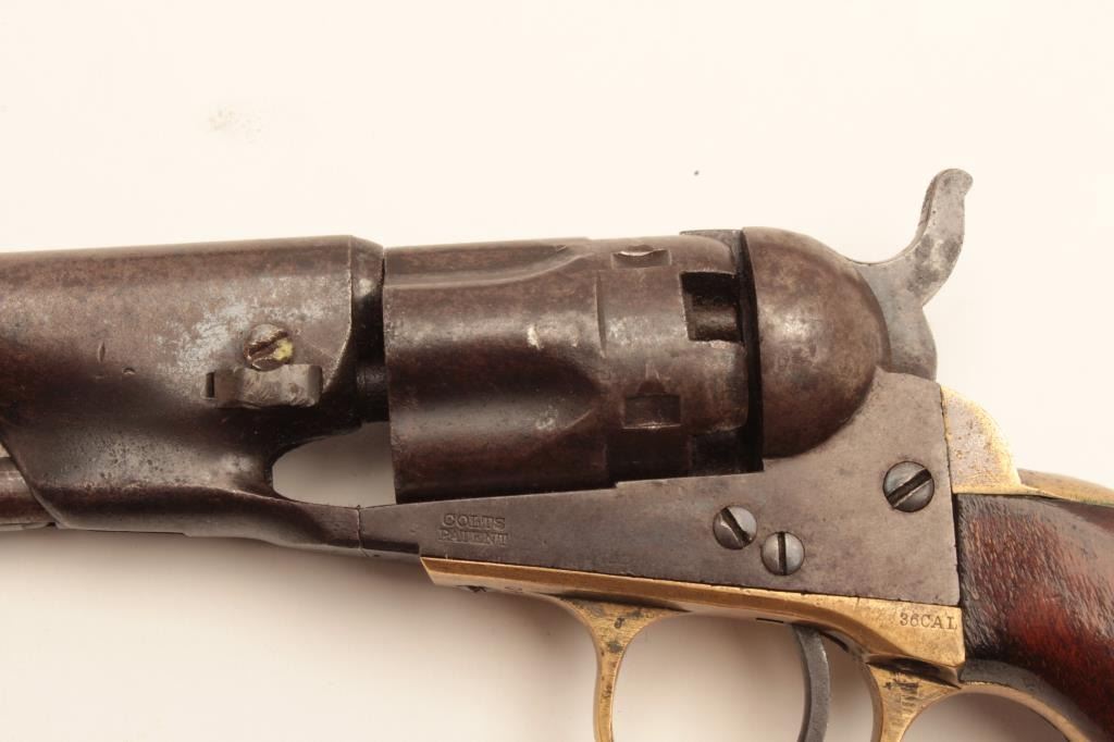 Colt 1862 Police Model .36 caliber percussion revolver, S/N 35540 with a 5 ½” barrel. 30%-50% original blue and traces of case hardening. Very good grips with 50%-70% varnish. Matching serial numbers. The frontof the frame and bottom of the barrel lug show metal loss and distress from contact with bullet or grape shot. Loading latch is missing and end of the lever is broken at the latch area. With good flask, .36 caliberColt mold, and cap tin contained in Pelson 1980’s custom French style case. (Antique) Est.: $800-$1600