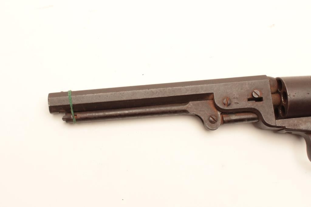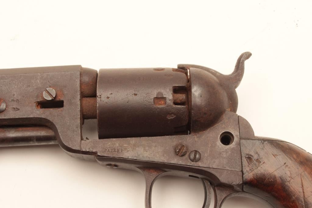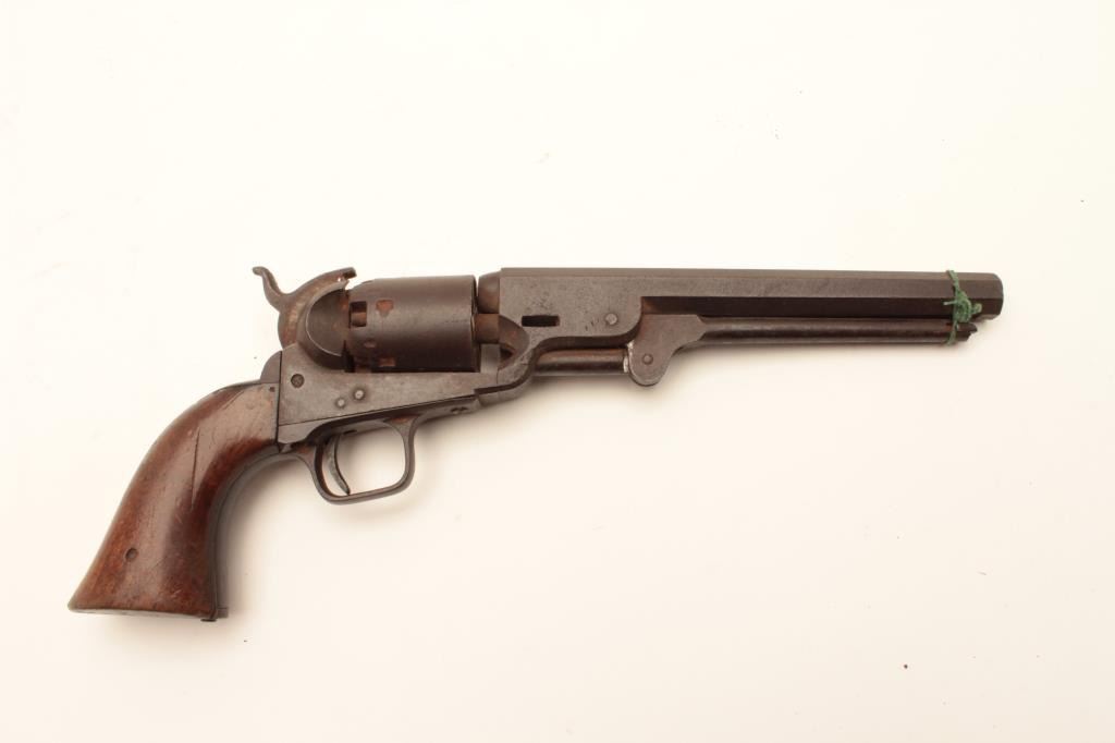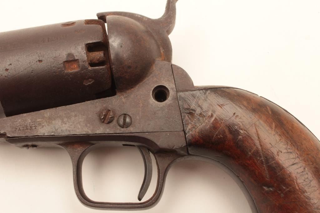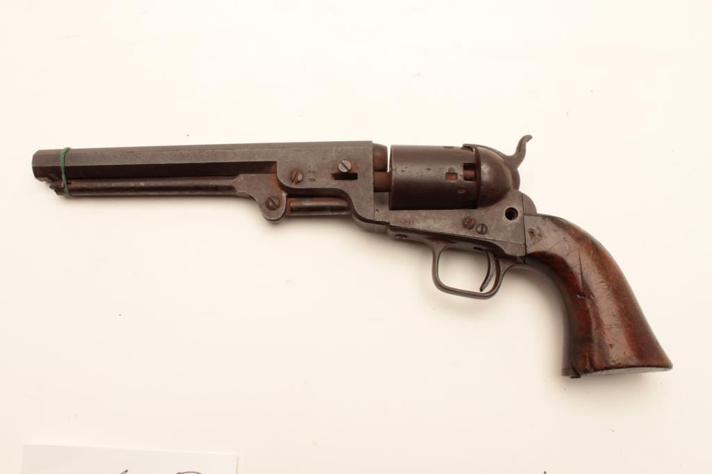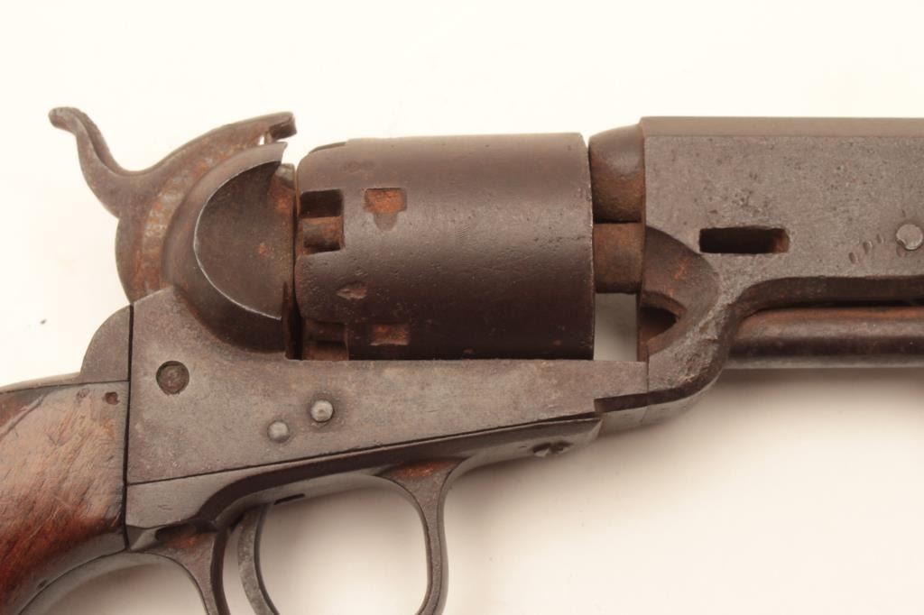 1851 London Navy .36 caliber percussion with London address and iron trigger guard, S/N 41269. As found “Out of the attic” unrestored condition. Missing wedge, hammer screw and lever latch. Deep brown patina. Not working.Matching visible numbers. The grips show a few chips, mars and small losses. Fair overall and restorable. (Antique) Est.: $400-$800