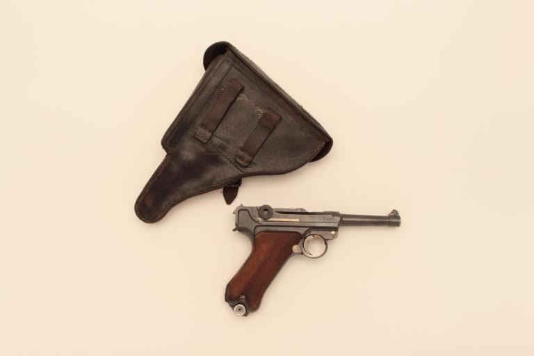1918 DWM Luger in 9mm with sear safety added post WWI for Weimar Republic Police use, S/N 1147a. 95% period blue finish with some minor erosion and pitting on the barrel from holster. Very good plus checkered wood grips. Some straw finish and niter blue on the springs. Matching visible Numbers except magazine. Bright bore and interior shows limited use. The magazine is numbered 122 with aluminum bottom. A 1926 dated andproofed holster by Berlin maker included (Holster is fair to good). A nice rig. (C&R/No PPT) Est.: $700-$1400