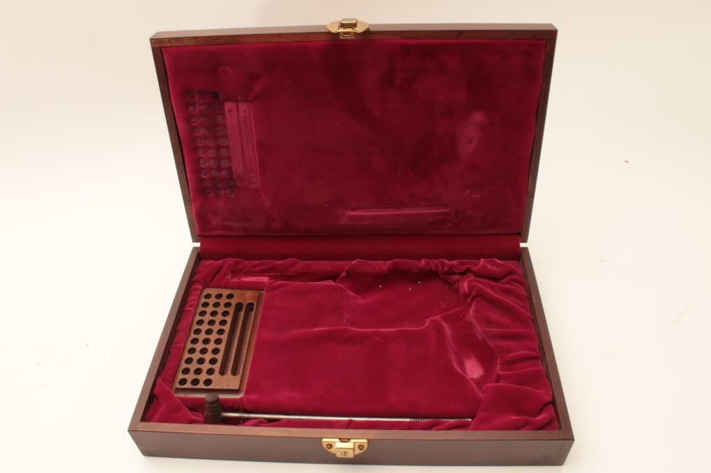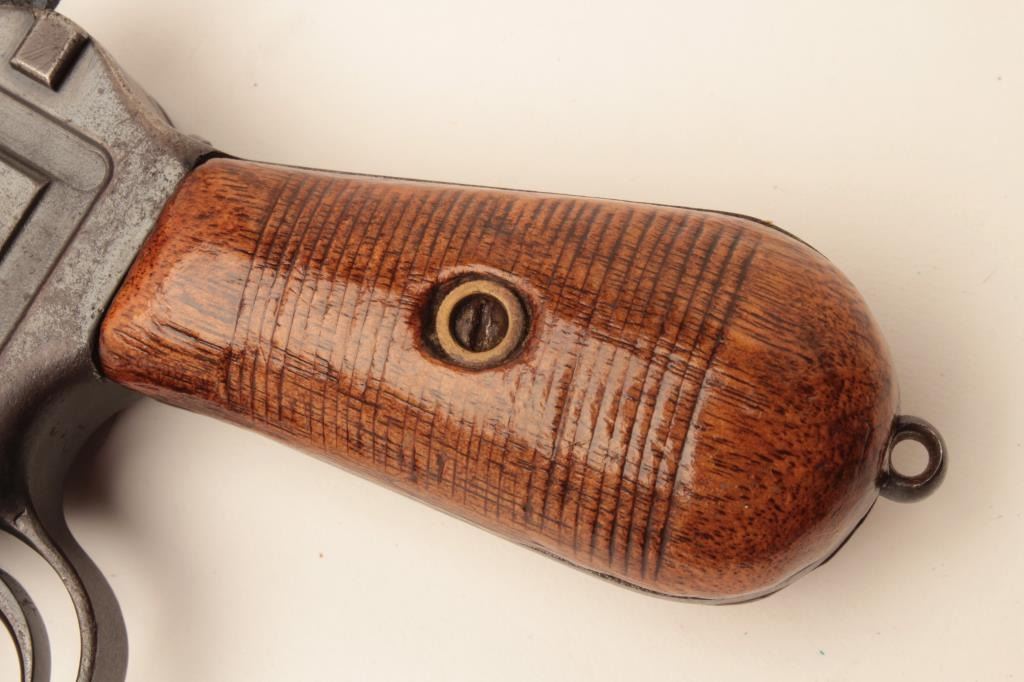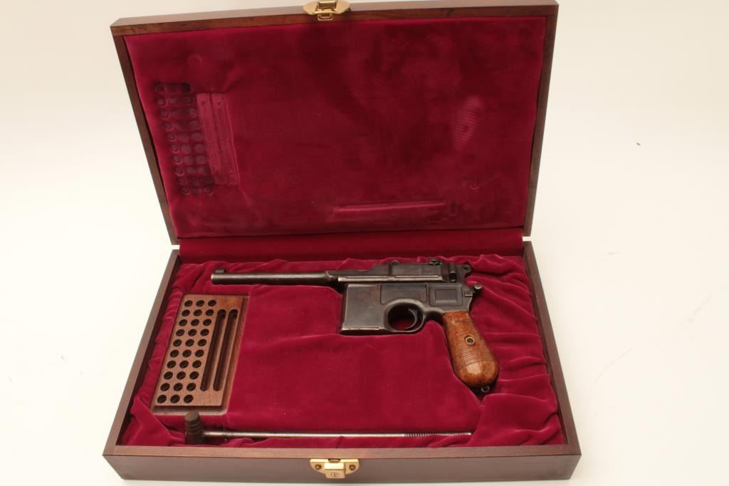 Mauser Model 1896 “Broomhandle” Semi-Auto pistol in 7.65 (.30 Mauser) caliber, S/N 141918 and the top end shows S/N 20351 (Mismatched). Shows 50%-70% old re-blue arsenal type finish with replacement orrefinished grips. Markings and edges are good. The bore is very good and mechanically sound. Import marked. Accompanied with a fine custom display case, 50 rounds of ammo, stripper clips, German cleaning rod andmilitary style shoulder holster. (C&R/No PPT) Est.: $750-$1500
