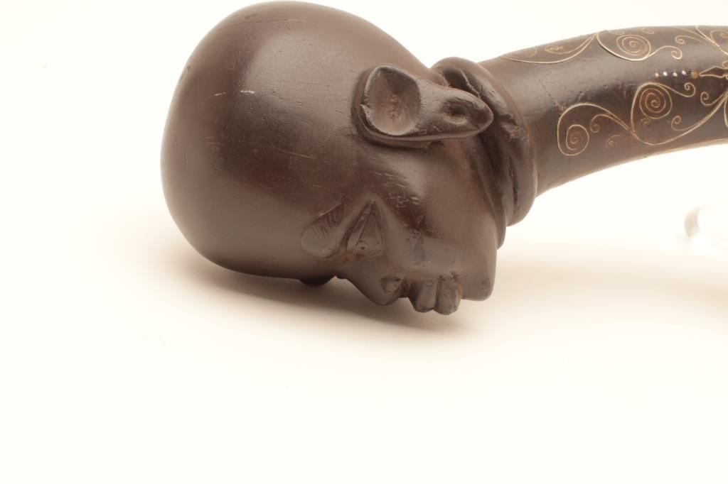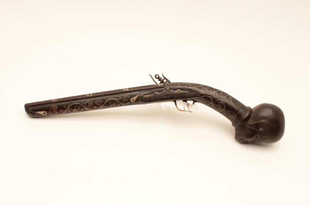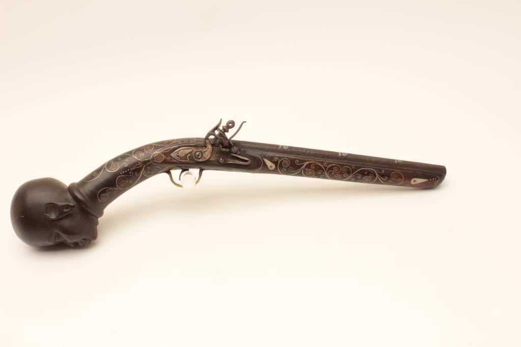 North African "Chieftan's" Flintlock Dag with carved Native Head Butt and Fancy Silver wire inlaid stock. 20th century made for Ceremony and as male jewelry more than as a functioning weapon. The bbl is Antique 18 or19th century and nicely silver inlaid in Mid Eastern style. The lock is hand made and crude but would work and sparks. The condition is very good except the older period bbl is pitted. Formerly Warren "Tom"Lewis collection who felt it was unique enough to include in his sophisticated early arms collection. 24" overall, 13" bbl, approx. .70 cal. Est:$1500-3000