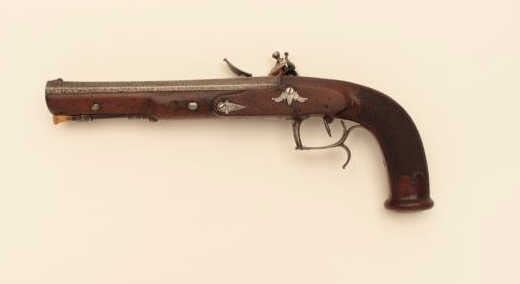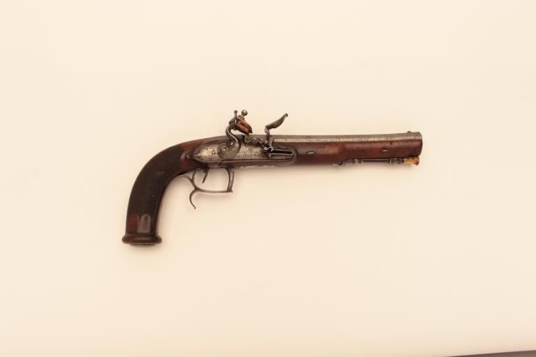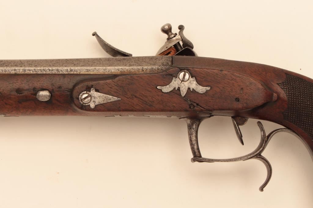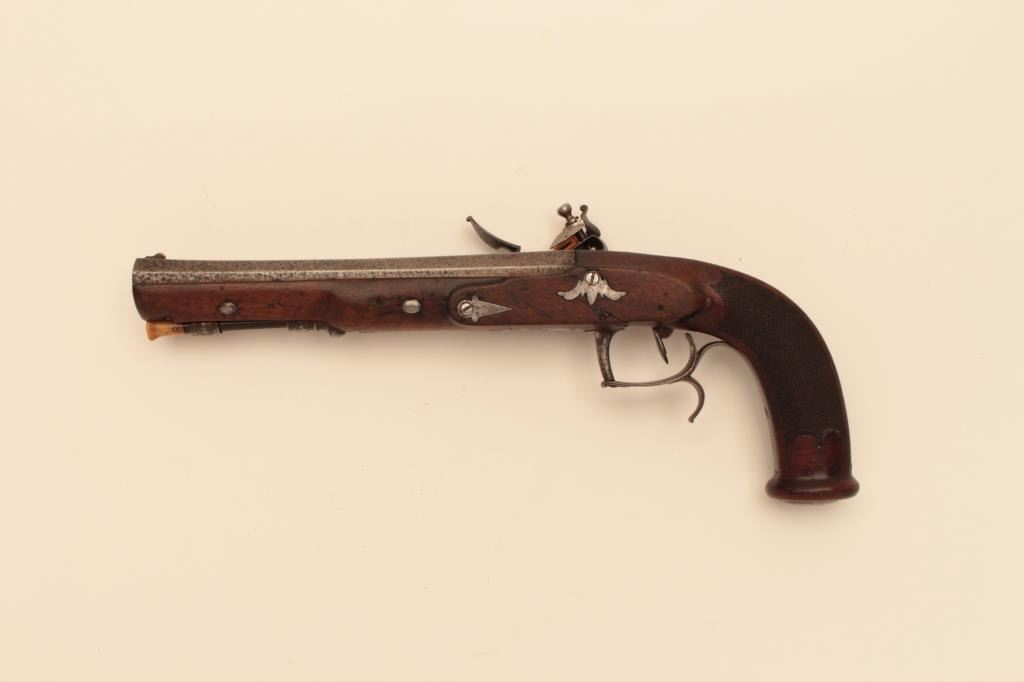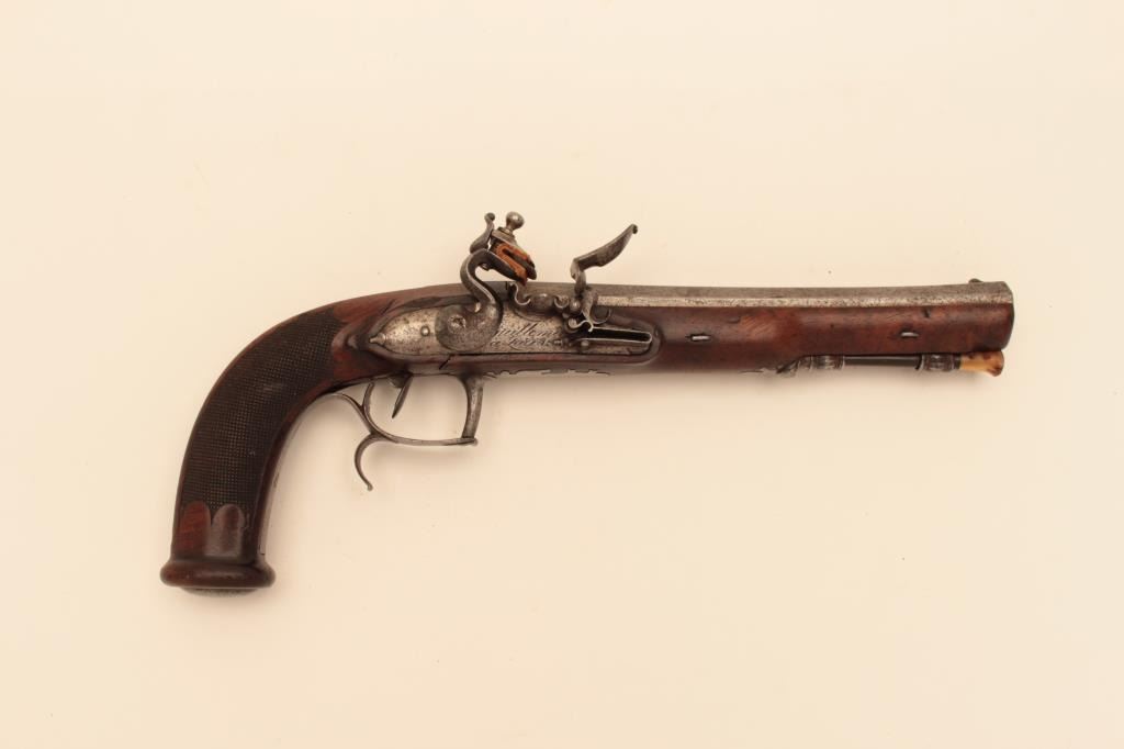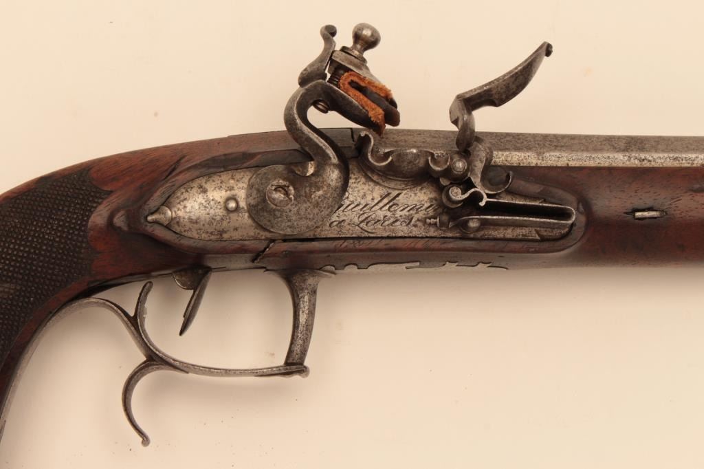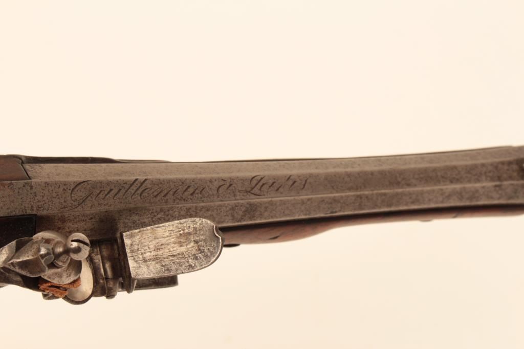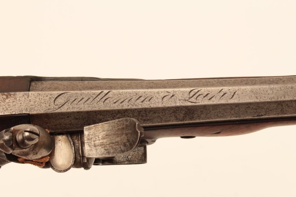 French Napoleonic Empire Period Flintlock Officer's style pistol signed Guilleman A Paris on lock and also on bbl. 14" overall with 8 1/4" octagon bbl with multi-grooved rifled bbl of approx. .60 cal. Full stockwith checkered and carved stock and square butt. Finely made French Hi-style lock with Platinum plug and pan. Good metal condition with gray patina and minor erosion on and pitting. Stock would ber very good exceptbreak beneath hammer probably from slipped main spring. Correct style horn tip ramrod. Works well and mechanism sound. Just the type that could have seen action from the Revolution to Waterloo in Napoleon's GrandEra. Est:$1250-2500